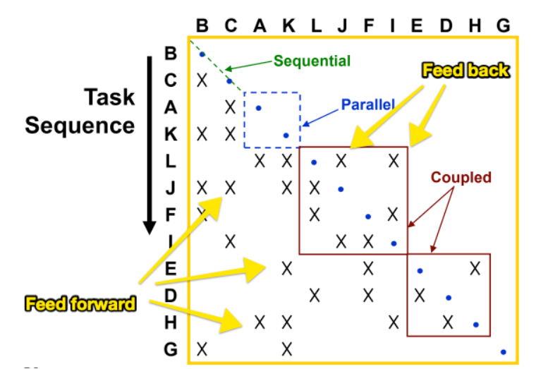 In Figure 4, we present a schematic of the DSM with tasks (A, B, C, …) arranged in temporal order. Marks located below the diagonal line represent forward information transfer to subsequent, dependent tasks, whereas marks above the diagonal denote cyclical loops where information may flow backward to earlier tasks. Such cyclic dependencies often signal the potential for rework, feedback iterations, or coordinated bottlenecks within the process. The “X” marks can be further specified as 1 (strong dependency), 2 (medium dependency), 3 (low dependency)