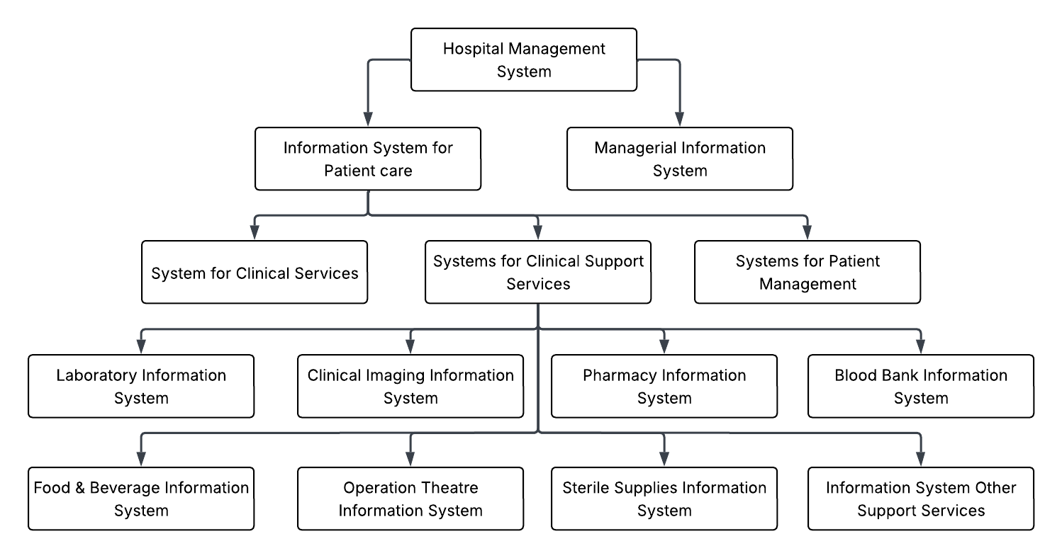 Here is a more complex decompositional view of a “hospital information system” with multiple level of sub-systems. The atomic elements in this system are: System for Clinical Services, System for Patient Management, Laboratory information system, clinical imaging information system, pharmacy information system, blood bank information system, food&beverage information system, operation theatre information system, sterile supplies information system, and information system for other support services.