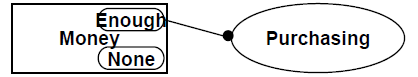 Conditional link: Process occurs if Operand is in certain state. For example, “purchasing” can only occur if you have enough “money” |