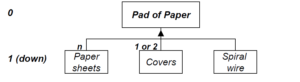 Take a look at the following decompositional view of “a pad of paper” as an example. In this simple 1-level system, the atomic elements are: paper sheets, covers, and spiral.